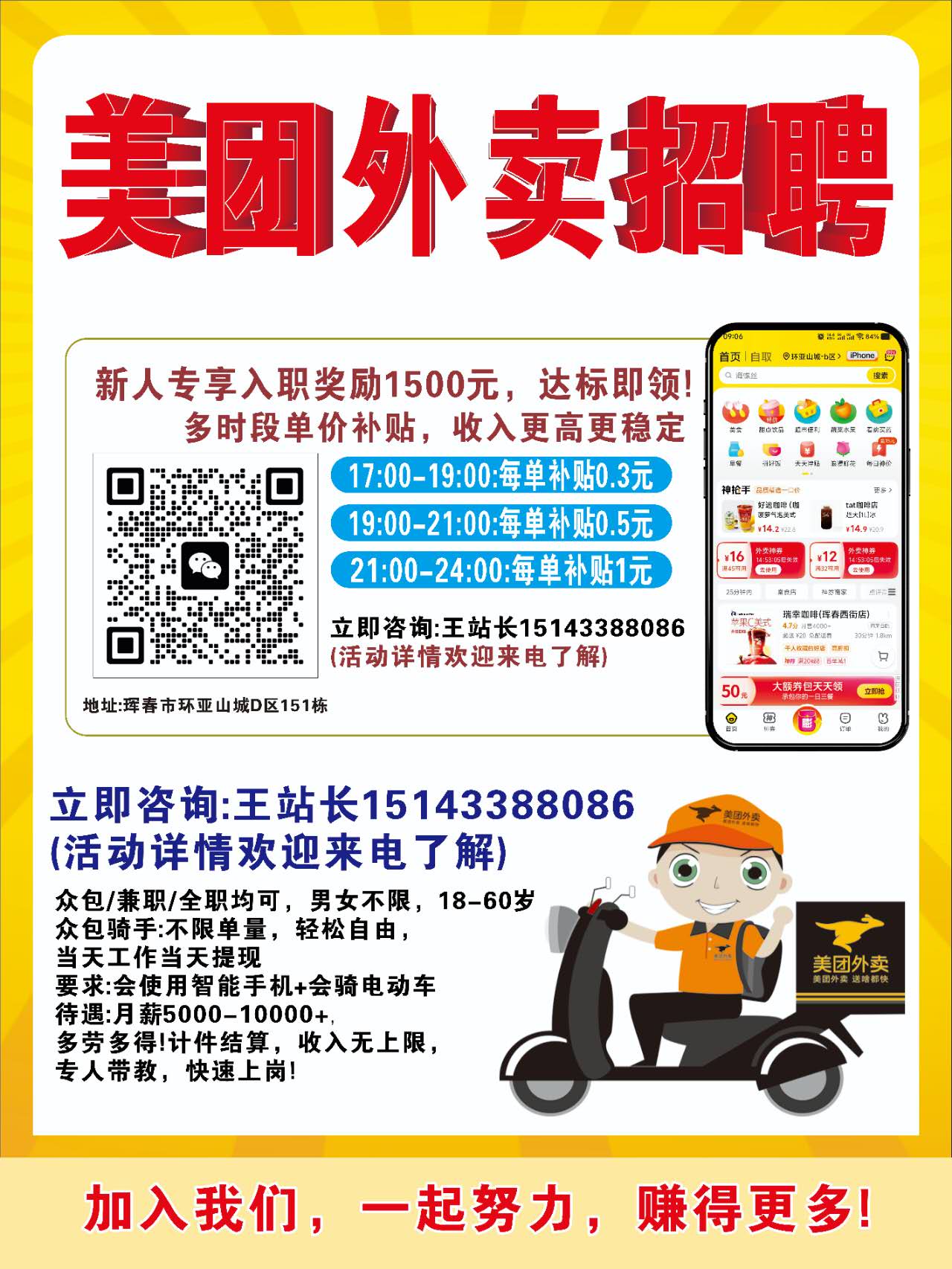 美团外卖招聘骑手,纯新人奖 3月单量满足3000单 1500元