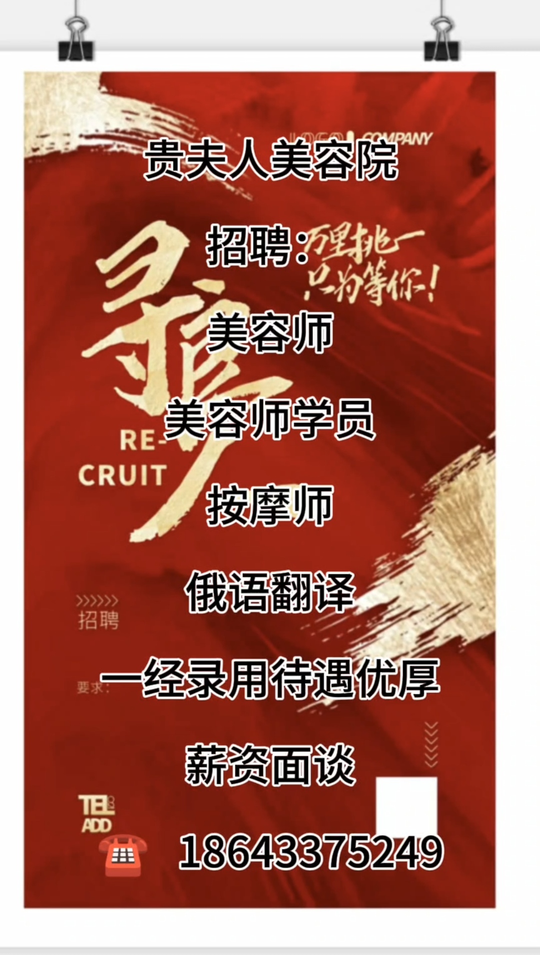 贵夫人美容院 重金招聘: