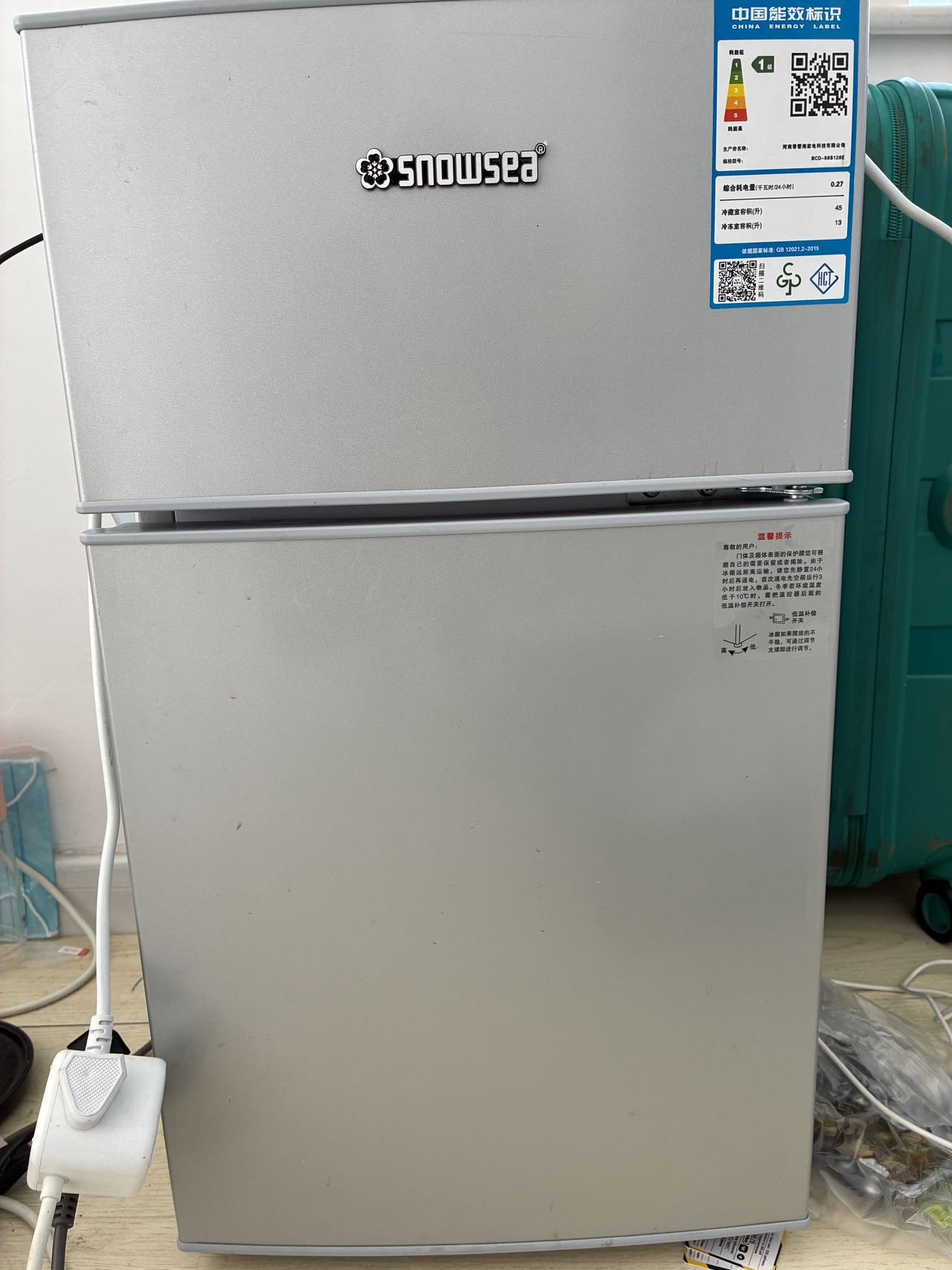 香雪海双门小冰箱,200元,今年夏天刚买的,型号BCD-58S128E,一级能效超省电。冷藏室45升,冷冻室13升,总容量58升。外观银色,制冷效果好,噪音小。