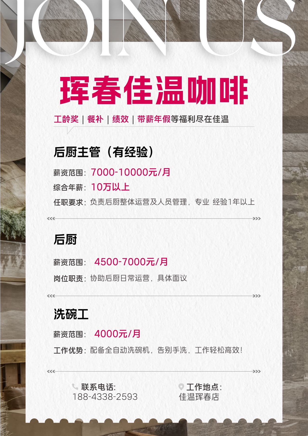 工作优势:配备全自动洗碗机,告别手洗,工作轻松高效!