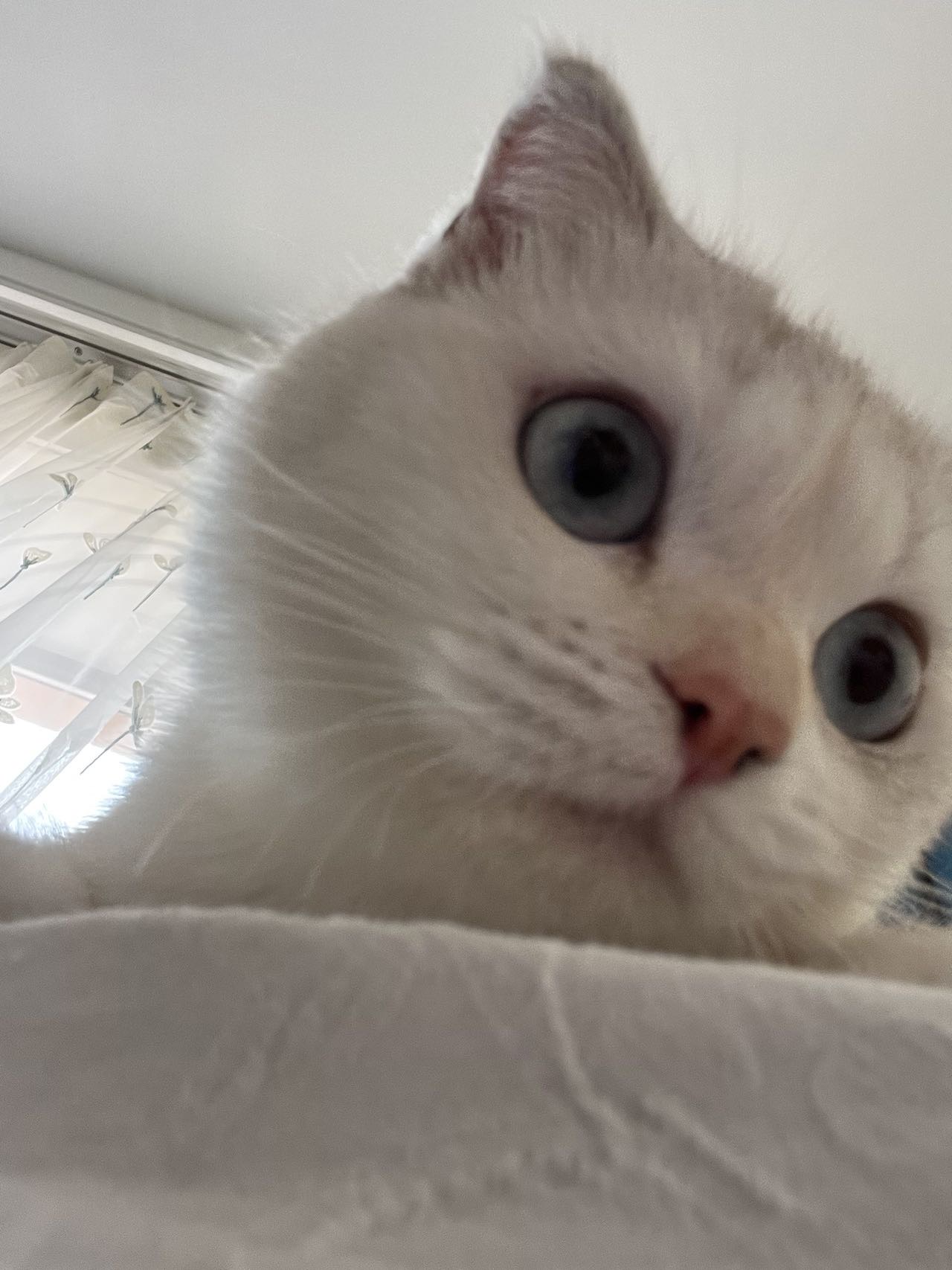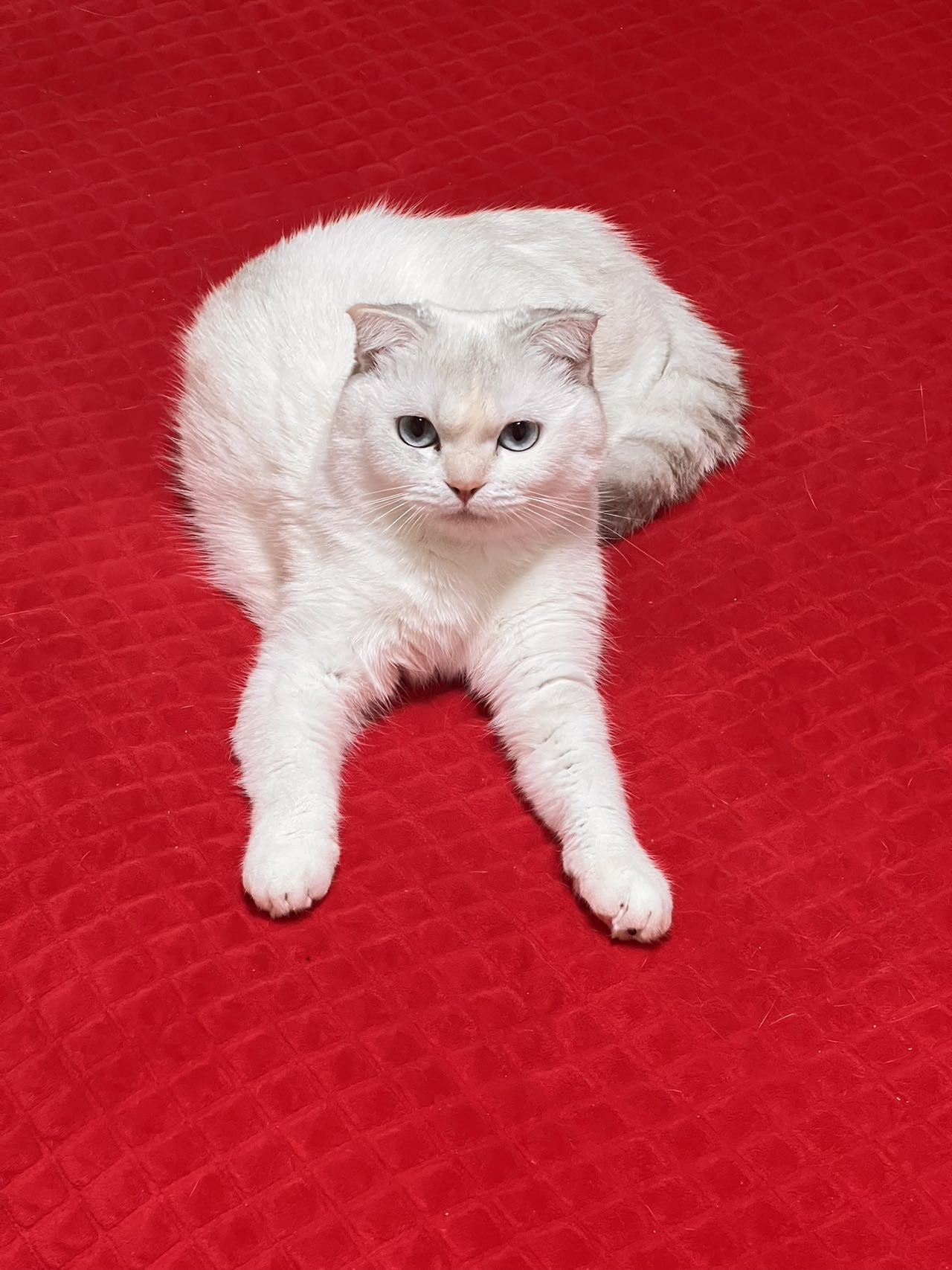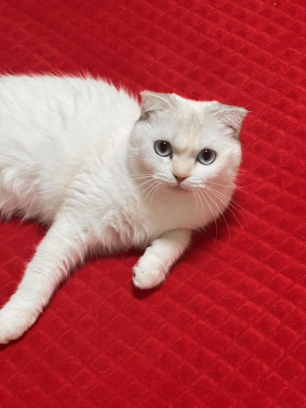 · 外貌:白猫,带银渐层血统(有折耳基因,但耳朵立耳,身体健康)