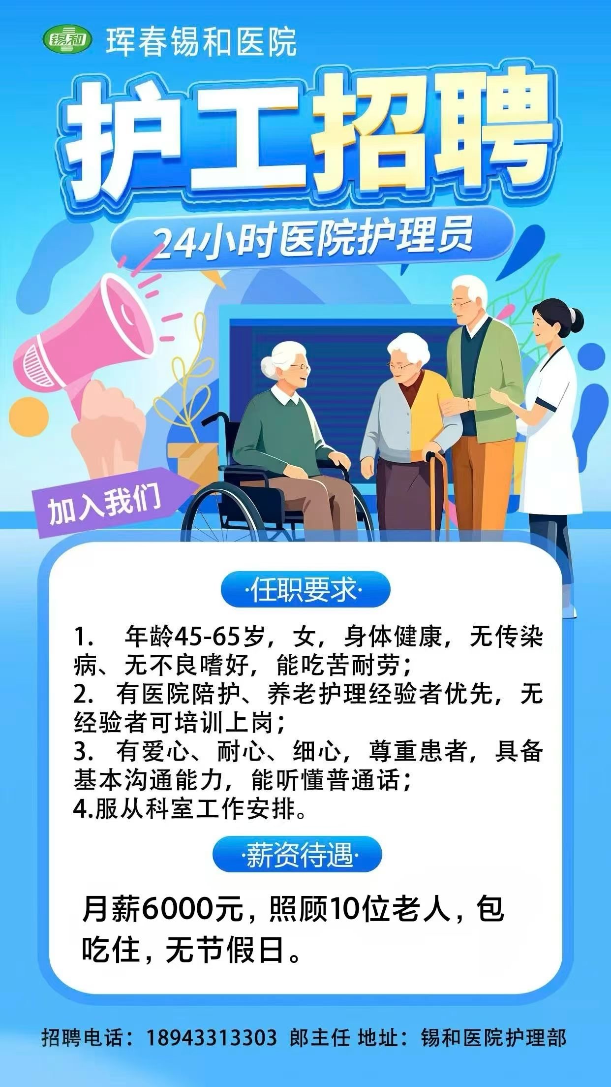 3. 有爱心、耐心、细心,尊重患者,能听懂普通话,服从科室安排