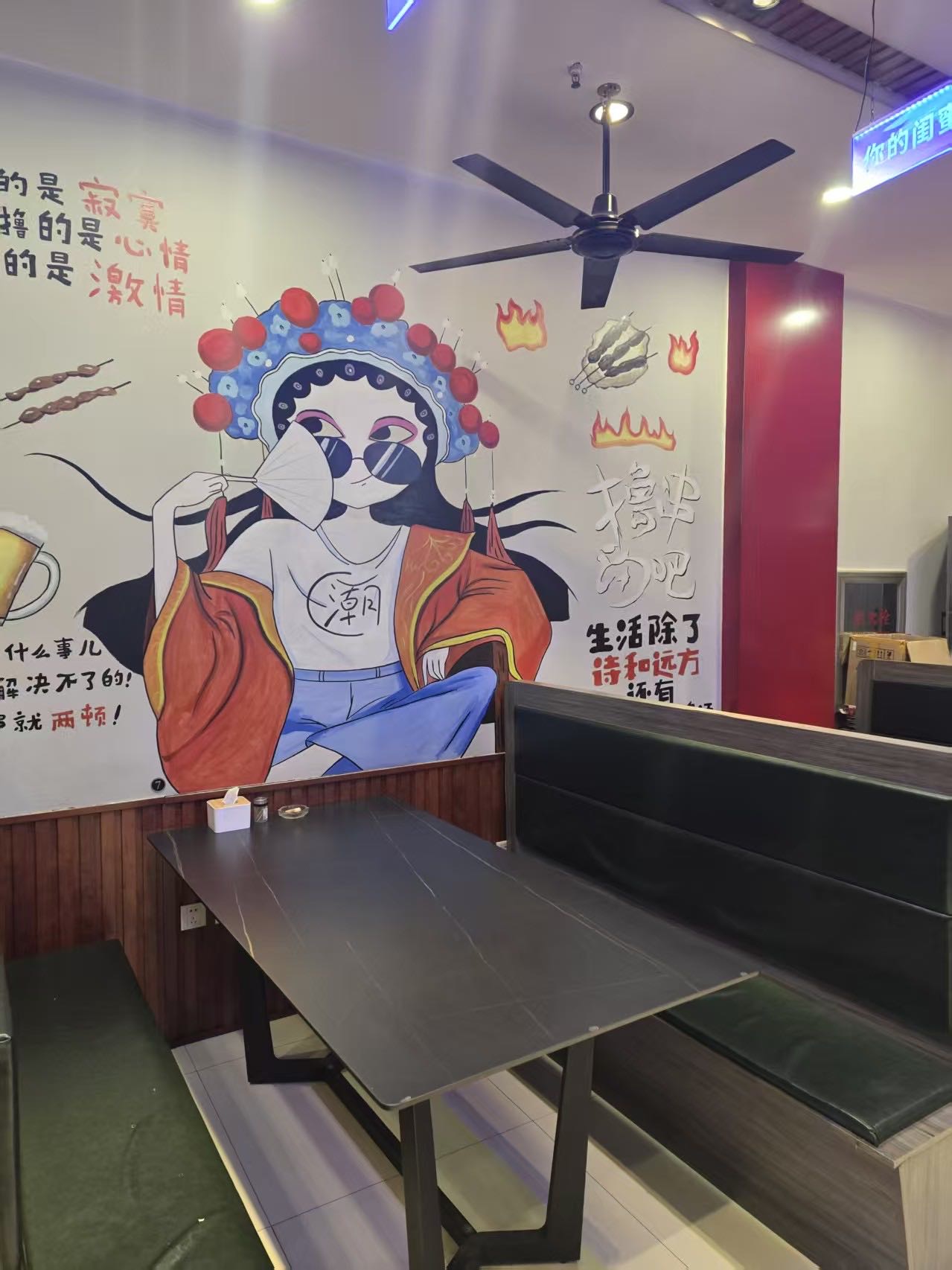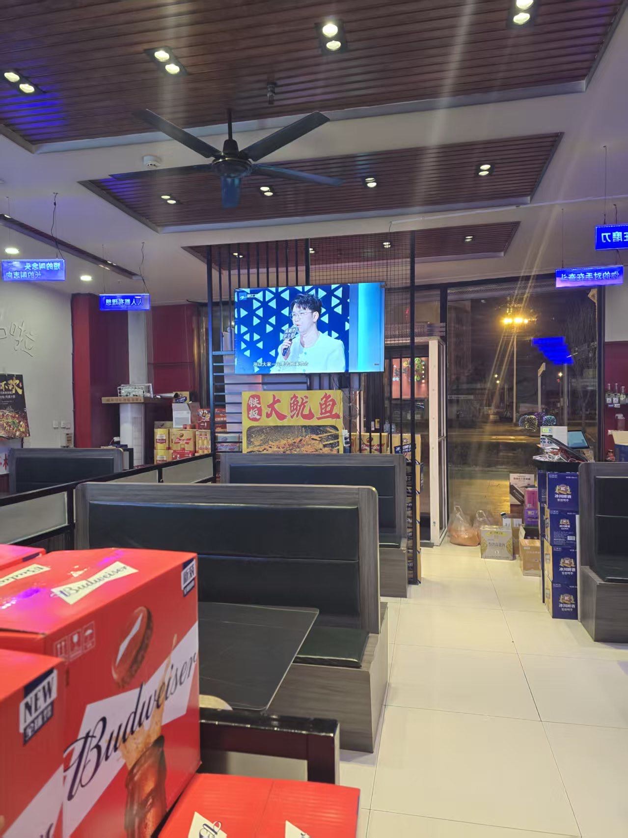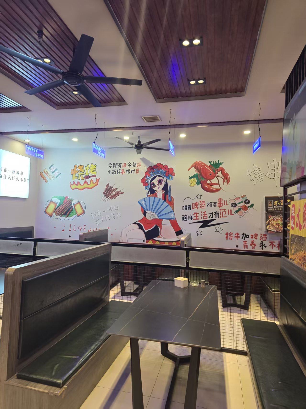 店里啥都现成的:烧烤炉、冷藏柜、桌椅板凳、收银系统全有,都是正经能用的,不用你再额外花钱买设备。装修也是现成的,客人进来坐着舒服,不用重新装。